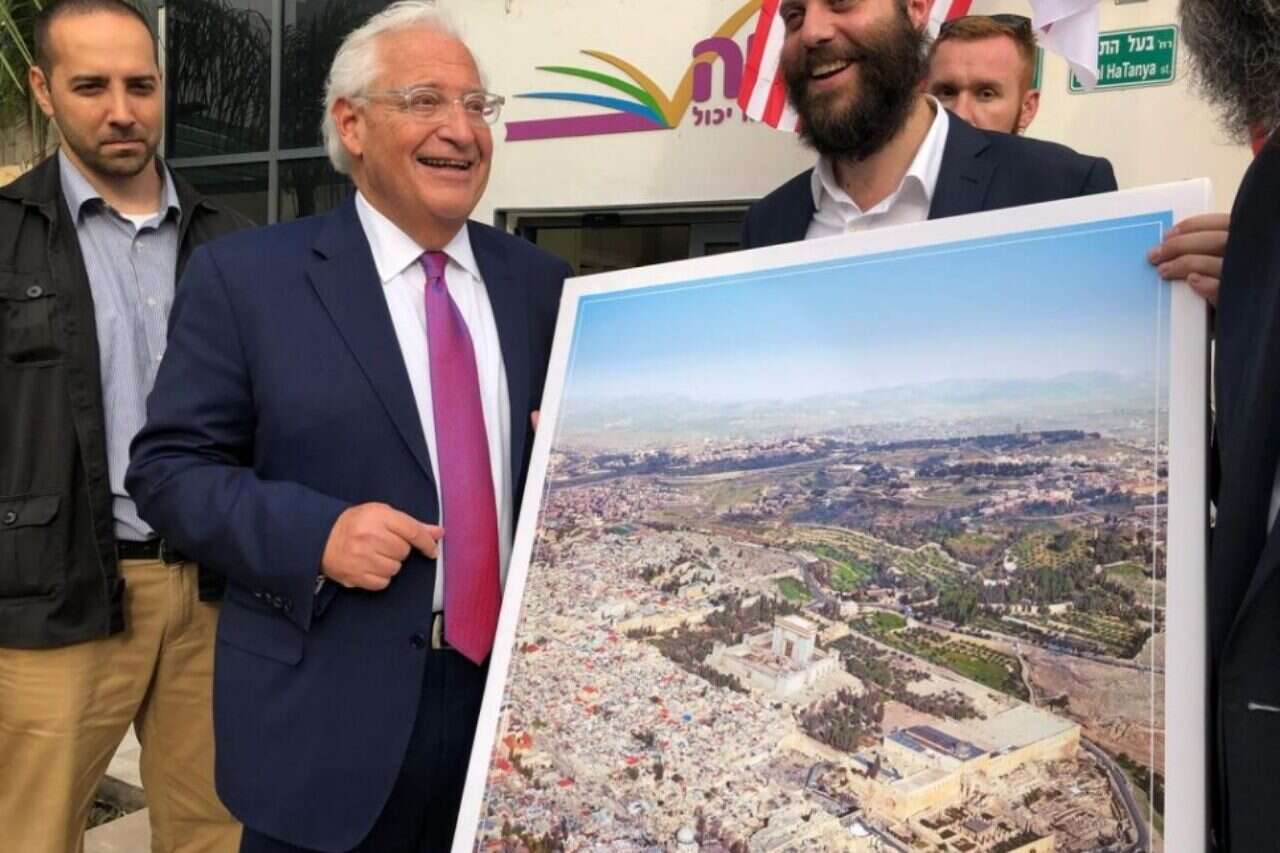 שגריר ארצות הברית בישראל דויד פרידמן קיבל היום (שלישי) ציור ענק של ירושלים ממבט הציפור, כשבמרכזו בית המקדש במיקום שבו נמצא היום מסגד אל אקצא וכיפת הסלע בהר הבית, כך פרסם ישראל כהן באתר "כיכר השבת".