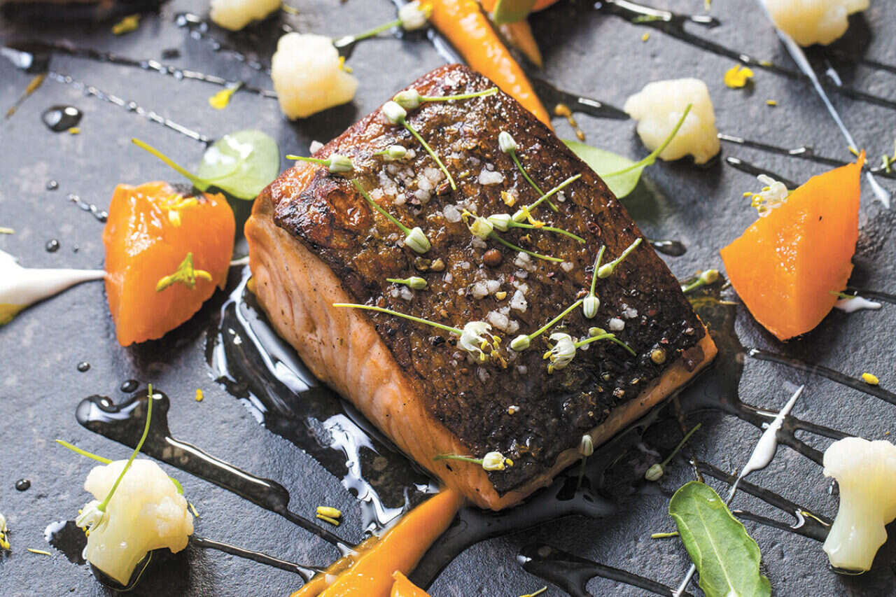 צילום: איתיאל ציון // סלמון אפוי עם משמשים קלויים ופסטו פיסטוק. מנה חגיגית שמתאימה לכל ארוחה