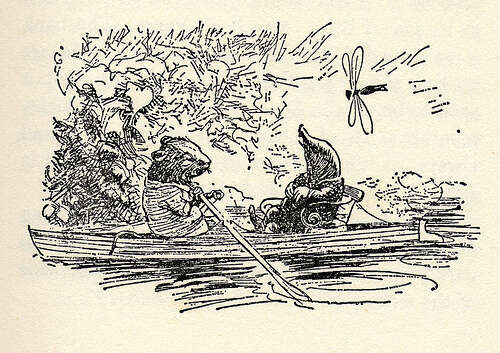 "בעודו צופה במאורה, ראה משהו קטן ומבהיק מנצנץ מתוך לב־לבה, נעלם ומנצנץ שוב כמו כוכב זעיר... ואז, בעודו מתבונן, הדבר קרץ אליו – ובכך הודיע ברבים שהוא עין; ופרצוף קטן צמח אט־אט מסביב לו, כמסגרת מסביב לתמונה. פרצוף חום וקטן עם שפם... 'שלומות, חפרפר!' אמר נברן המים. 'שלומות, נברן!' אמר חפרפר. 'תרצה אולי לקפוץ לביקור?' שאל הנברן כעבור רגע. 'אה, לדבר זה קל', אמר החפרפר בצורה די קטנונית, שכן הנהר והחיים לחופו ומנהגיו היו חדשים לו".