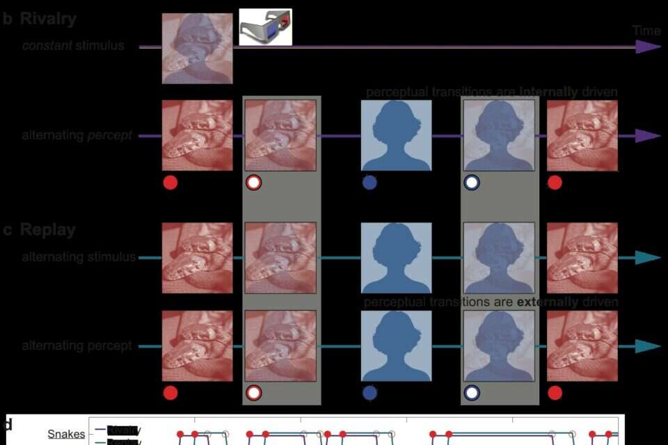 במילים אחרות: המציאות החיצונית אינה משתנה – לכל עין מוצגת תמונה קבועה; והשינוי היחיד מתרחש בתוך המוח עצמו. "בדרך זו הצלחנו לבודד את הרגע המכריע שבו פורצת חוויה חדשה למודעות", אומרת ד"ר ליעד מודריק מצוות המחקר. החוקרות מצאו שינוי במוח, או ליתר דיוק בתאי עצב שבאונה הקדמית האמצעית, שמתחיל 2 שניות לפני שהנבדק מדווח על התחלפות התמונה שהוא רואה. בהמשך, שנייה אחת לפני הדיווח, נרשמת פעילות חשמלית גם באונה הרקתית האמצעית, באזורים הקשורים לפעילות ויזואלית. מדובר בפרקי זמן ארוכים מאוד במונחים של הפעילות המוחית, שנמדדת לרוב באלפיות השנייה (בניסוי בקרה, כאשר הוקרן לנבדקים, מול שתי העיניים, 'סרט חוזר' של חילופי התמונות הספונטניים שעליהם דיווח הנבדק, נרשמו זמני תגובה קצרים בהרבה).
