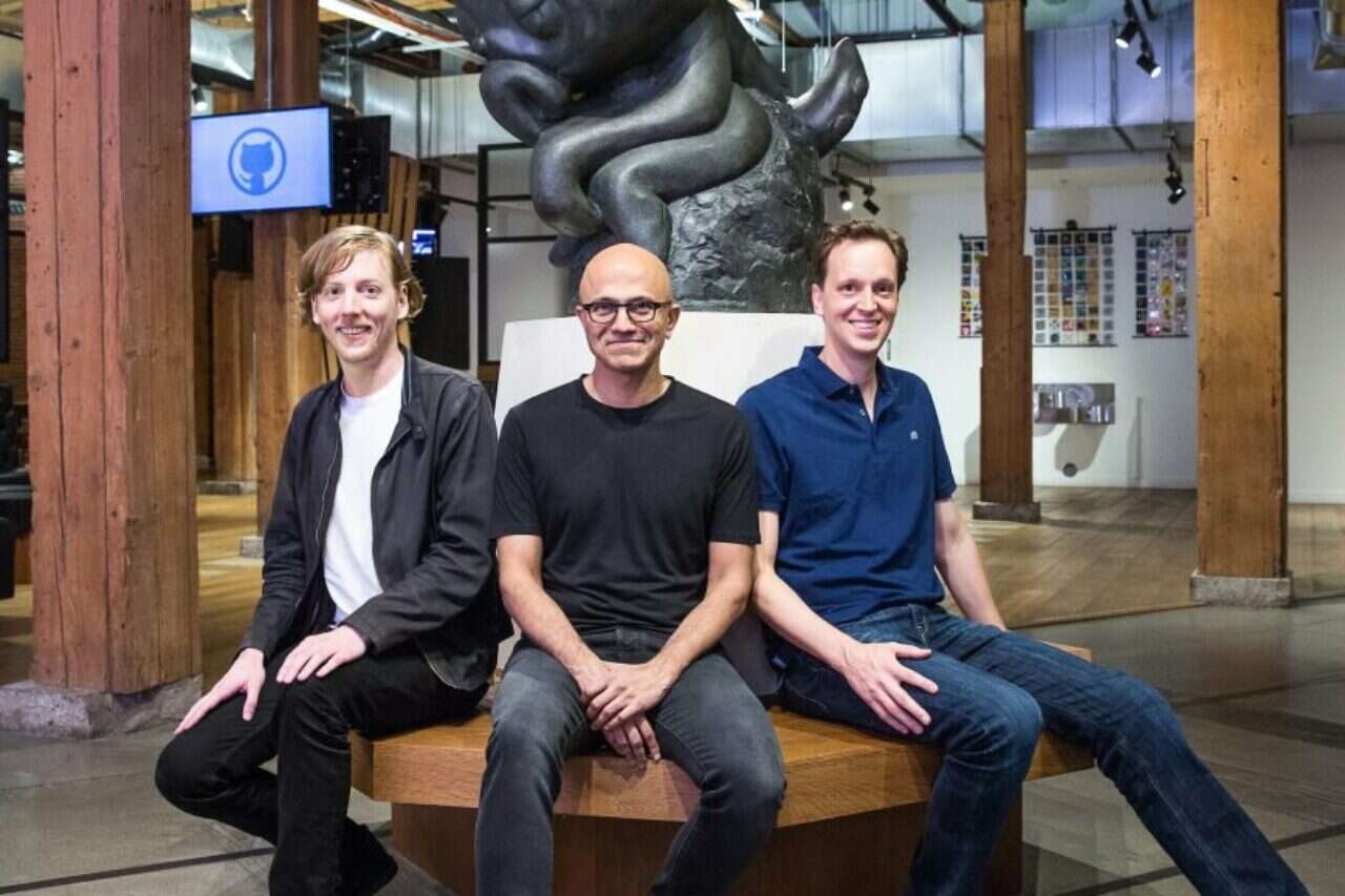 מימין לשמאל: נאט פרידמן, סגן נשיא במיקרוסופט, מנכ"ל מיקרוסופט סאטיה נאדלה וכריס וואנסטראת', מייסד שותף של GitHub // צילום: מיקרוסופט