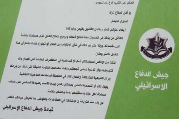 צה"ל הטיל היום (חמישי) באמצעות מטוסים כרוזים ברחבי רצועת עזה, המזהירים מפני התקרבות לגדר ופגיעה בה. הכרוזים נפתחים בברכה: "תושבי רצועת עזה! השלום עליכם, ו'שישוב עליכם חודש רמדאן בברכה'". לאחר מכן צוטט המשפט: "אל תשפוט דבר אלא לאחר שאתה מבין אותו לאשורו".