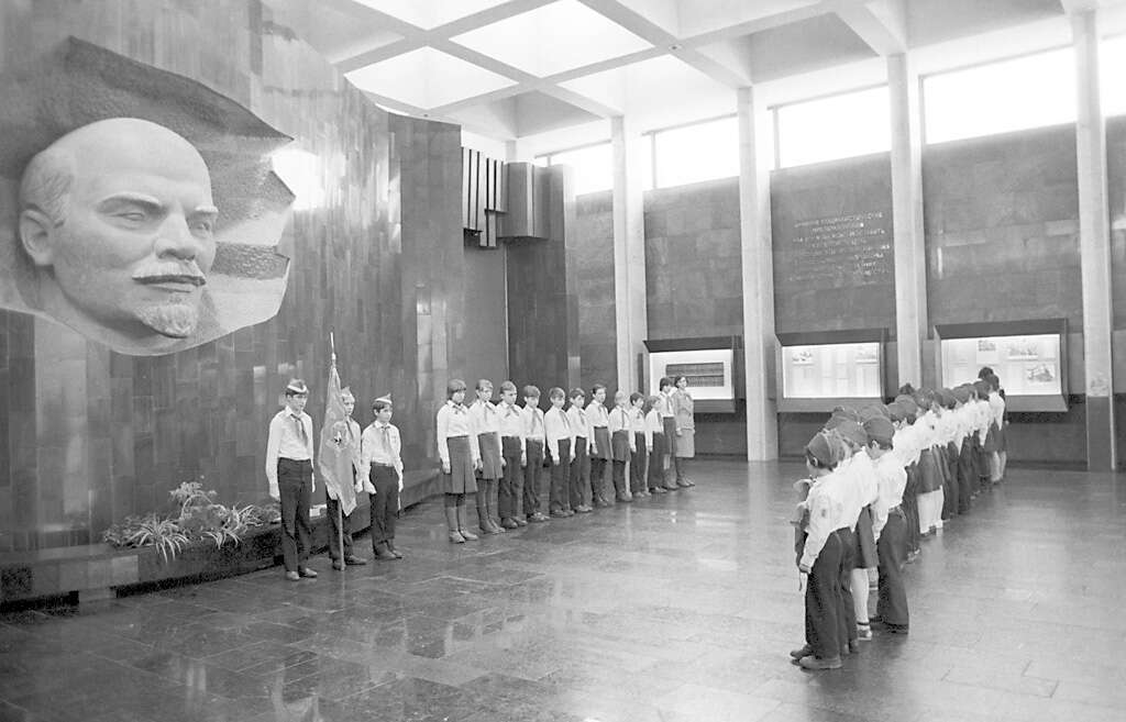 רומן על חולשות אנושיות. נערים בטקס במוזיאון הרכבת במוסקבה, כשברקע דיוקן ענק של לנין, בתצלום משנת 1984