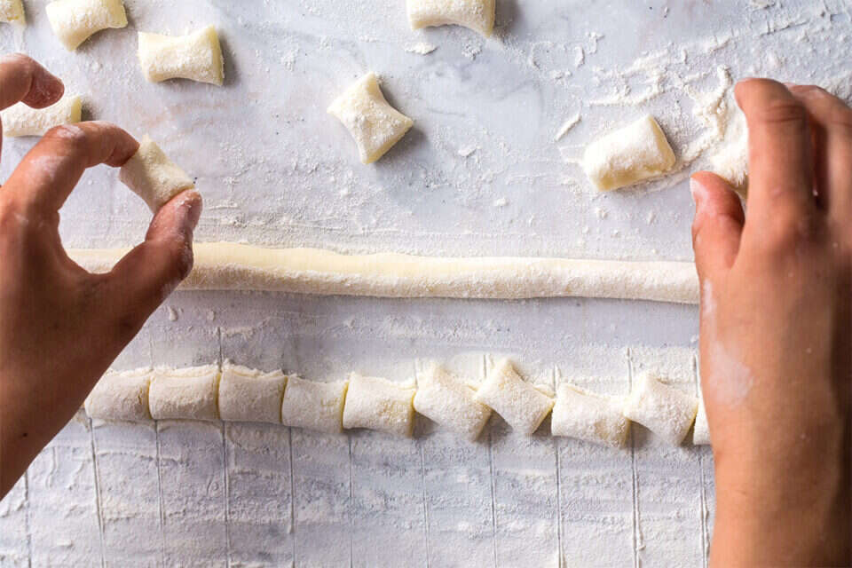 צילום: איתיאל ציון // חותכים את נקניקי הבצק לחתיכות באורך 1 ס"מ. הכנת הניוקי