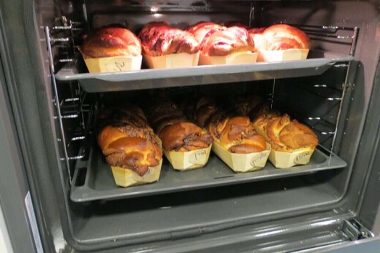 5. חוצים לאורך ל-2 חלקים שווים וקולעים צמה. מכניסים לתבנית באורך 30 ס"מ (אינגליש קייק מס' 3) ומתפיחים 45 דקות.