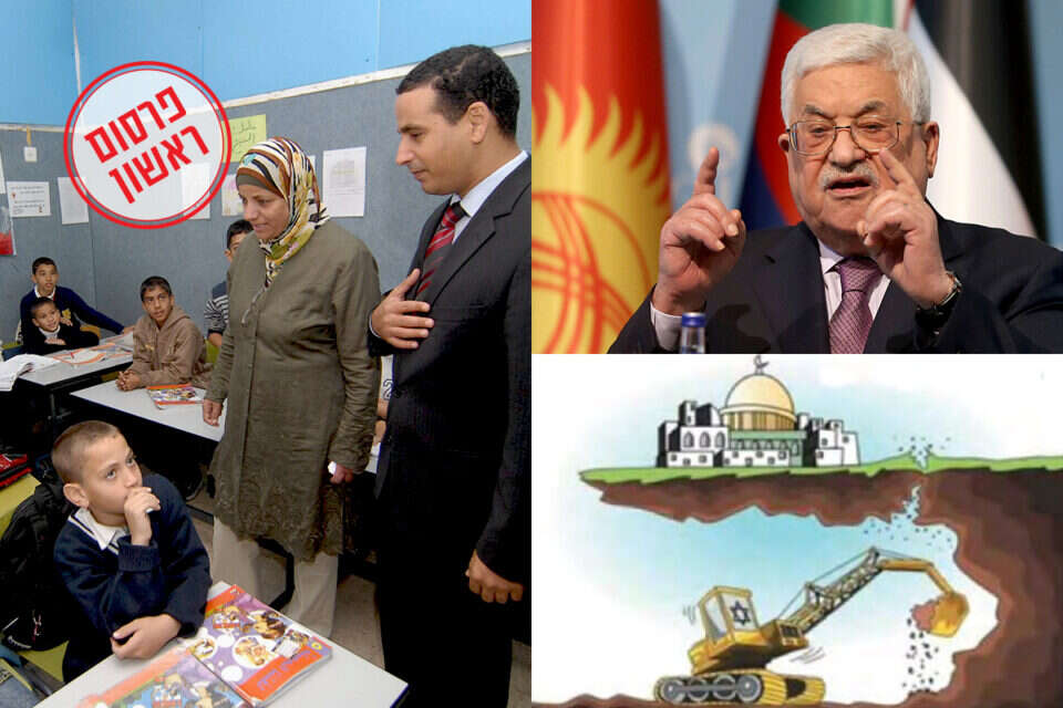איור של דחפור חופר מתחת להר הבית, בספר לימוד פלשתיני // צילומים: IMPACT-SE, AP, אוריה תדמור