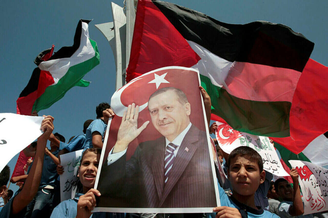 ילדים מפגינים בעזה עם תמונות של נשיא טורקיה ארדואן , צילום: רויטרס