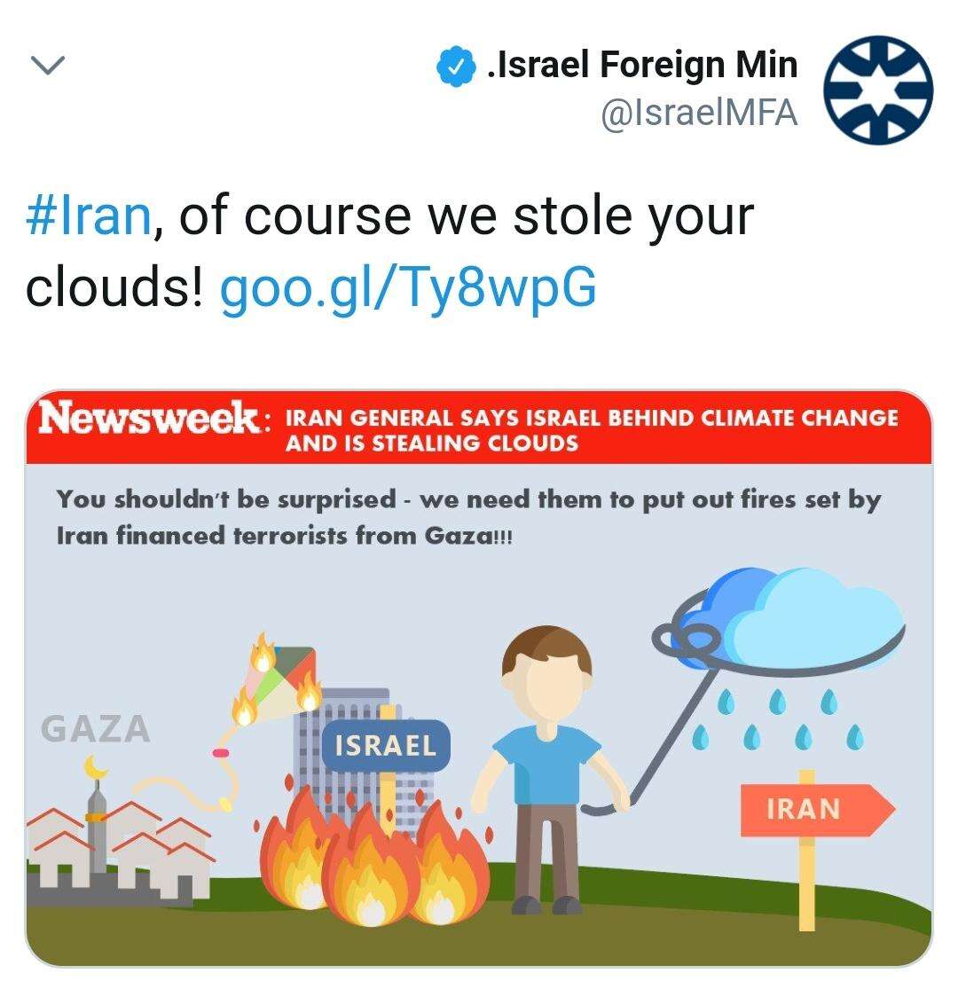 בתגובה היתולית להאשמות האיראניות על כך שישראל "גונבת" עננים מאיראן מוכת הבצורת, ענה היום משרד החוץ לועג לאיראנים: "כמובן שגנבנו לכם עננים - היינו צריכים לכבות את השריפות מעזה".