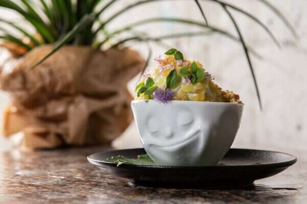 מנה ראשונה: ברוסקטת סשימי דג ים, קרם שעועית לימה, ויניגרט עגבניות סלסה ורדה ועלי חרדל, 93 שקלים.