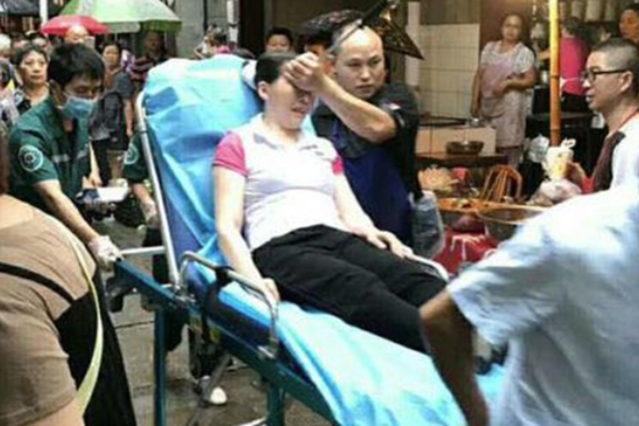 בסרטון שלפניכם, שמגיע מסין, נראית סועדת מובלת החוצה מהמסעדה כשסכין גדולה נעוצה בתוך עינה. היא מתפתלת מייסורים ומהיסטריה, תוך שמספר גברים שנושאים אותה, ממהרים להביאה אותה לבית החולים במהירות דרך ההמון.
