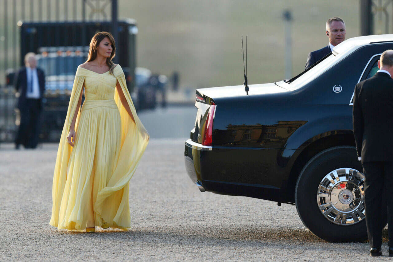 במפגש עם תרזה מי ובעלה, נראתה מלניה בשמלה כמו באגדות, שהזכירה במעט את בל מ"היפה והחיה" (מה שהופך את טראמפ לחיה, אבל לזה לא התכוונו). השמלה הצהובה הארוכה הסתיימה בשובל תואם שהתנפנף ברוח, מראה שעוד ידובר עליו רבות.