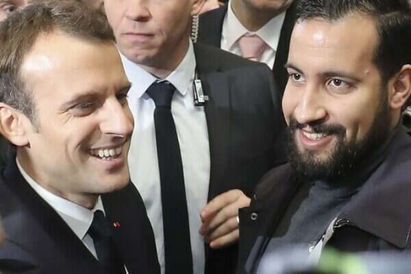 חנק והכה את המפגינים. אלכסנדר בנאלה ועמנואל מקרון // צילום: אי.פי