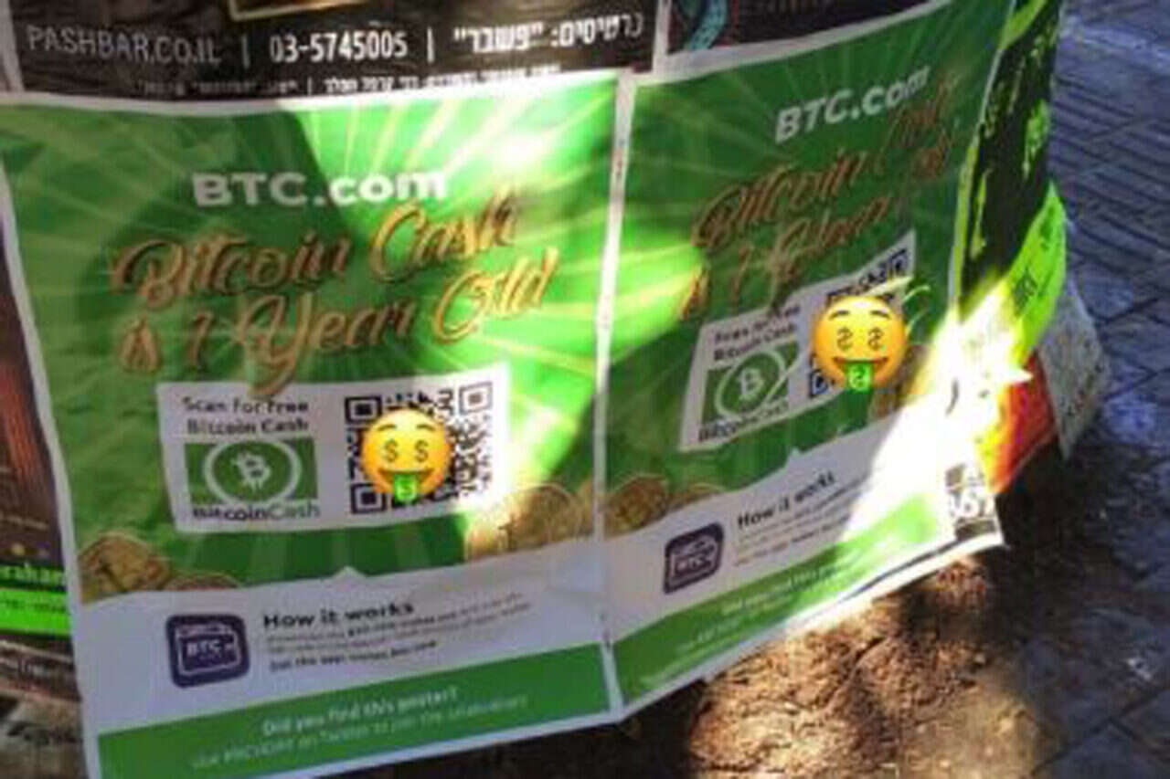 מאות פוסטרים הודבקו הבוקר (רביעי) ברחבי תל-אביב עם ההבטחה: סרוק את הקוד וקבל ביטקוין קאש במזומן. ואכן, מבירור קצר עולה כי מדובר בהבטחה אמיתית, וכי מאחורי השלטים עומדת חברת BTC.com, המפתחת ארנק ביטקוין, אשר חוגגת שנה להיווסדו של ביטקוין קאש.