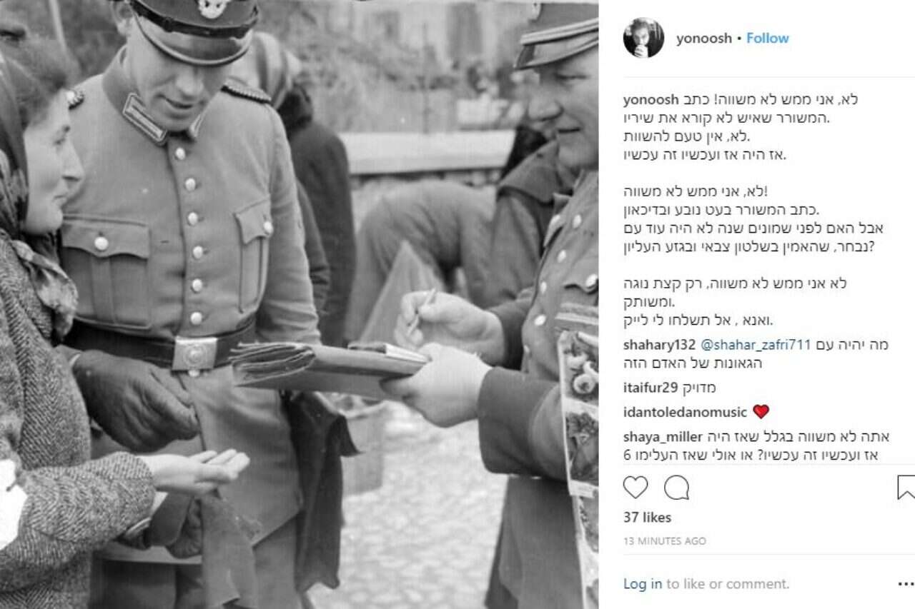 עוד פרובוקציה מחליאה: המשורר והסופר יהונתן גפן פרסם הערב (ראשון) פוסט מקומם בחשבון האינסטגרם שלו, בו מחה על חוק הלאום והשווה בין עם ישראל לנאצים. גפן ניסה לטעון כי "אני ממש לא משווה" - אך מייד לאחר המילים הללו ערך את ההשוואה המזעזעת וכתב: "האם לפני שמונים שנה לא היה עוד עם נבחר, שהאמין בשלטון צבאי ובגזע העליון?", וצירף תמונה של חיילים נאצים.