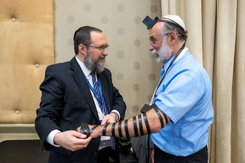 "בארוחת הצהריים שוב נפגשנו. הזכרתי לו פעם נוספת את נושא התפילין והפעם הוא אמר: 'כן'. מיהרתי להביא זוג תפילין ולהניח לו. מרוב התרגשות לא יכולתי לעצור בעצמי. ניגשתי אל המיקרופון ואמרתי לפני הקהל הגדול שמנה אלף מאה וחמישים משתתפים, כי מתוקף נסיבות ילדותו מר רוברט מריופול-רוזנברג לא חגג בר מצווה. הוא גם לא הניח תפילין מעולם. אבל עכשיו בוועידה הזו, הוא עשה זאת לראשונה. באולם הגדול כולו פרצה סערת רגשות ובתוך רגע התחיל הציבור לשיר ולרקוד. 'חתן בר המצווה' בן ה-71 אפילו הורם על כפיים... בליבי חשבתי, כמה נפלאות דרכי ההשגחה העליונה. ילד יהודי אמריקאי שלא חגג בר מצווה בגיל שלוש-עשרה חוגג את הנחת התפילין הראשונה שלו ברוב עם במעמד של יותר מאלף נוכחים..."מאוחר יותר, כשהרוחות נרגעו, שאלתי אותו מה הוא עצמו חשב כשהנחת התפילין שלו הפכה לחגיגה גדולה כזו. בתחילה הוא חייך ואמר: 'במהלך הריקודים חשבתי רק על דבר אחד: שלא אפול ולא אשבור את הגב ואשוב הביתה בריא ושלם... ובנימה רצינית יותר – אני כבר לא צעיר אבל כל העניין היהודי די חדש לי. כשאחזור הביתה, אחשוב על זה בנחת, אתחיל לקרוא ולהתעניין ונראה מה יהיה'. "אתה בדיוק כמו עם ישראל במעמד הר סיני, אמרתי לו. תחילה הנחת את התפילין בפועל, ובשלב הבא אתה עומד ללמוד על כך. כך גם הם עשו. קודם נעשה ואחר כך נשמע", סיכם בסיפוק.