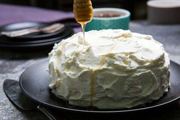מרכיבים את העוגה: מצפים את העוגה בקצפת ומקררים עד להגשה. אפשר לזלף מעט דבש על העוגה לפני ההגשה.