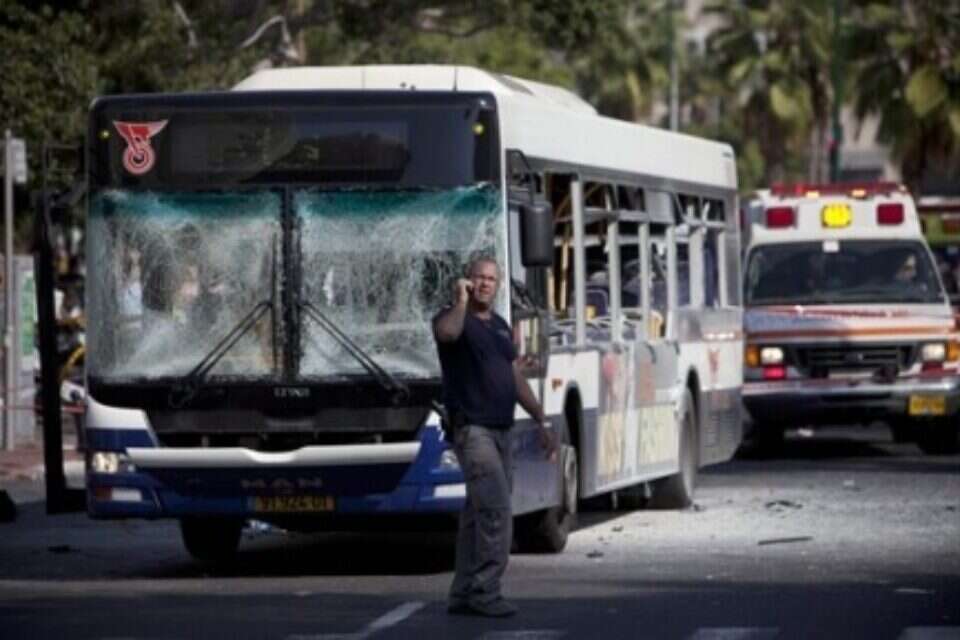 Police were conducting a massive manhunt in Tel Aviv after an explosive device was detonated inside a bus on Tel Aviv's Shaul Hamelech Street at noon on Wednesday in what police said was a terror attack. Magen David Adom medical services said 20 people were wounded in the attack. The bomb blew out the windows on the vehicle, a 76 line bus belonging to the Dan company, causing extensive damage but no fatalities. Tel Aviv Sourasky Medical Center officials said one person was seriously wounded, one person moderately wounded, and one person was listed in light-to-moderate condition. The official said that the three people were being operated on for blast, burn and shrapnel injuries, mostly from nuts and bolts lodged in their bodies. All the others were lightly hurt and some were being treated for shock. The attack, in central Tel Aviv, took place near the IDF Kirya military headquarters, Sourasky Medical Center, and the Tel Aviv Museum of Art. The military headquarters was placed on high alert after the attack. Police said that a person had thrown a bag into the bus on Shaul Hamelech Street and ran away. The bus was not especially full of passengers at the time. Police were conducting searches around the area and ordered people off the streets. Police Commissioner Yochanan Danino confirmed it was a terror attack. "One of the scenarios we have been preparing for is more than just rockets but also terror attacks in our cities. There is high motivation by the terror groups to hit our cities. We are massively deployed throughout the entire country with a special emphasis on the big cities. We are interviewing eyewitnesses and conducting an investigation in conjunction with the Shin Bet. If there is a terrorist on the loose we are doing everything to put our hands on him," Danino said. Police were conducting a chase after possible suspects in the area after the attack, saying that there were possibly two people involved in the attack. Police Special Forces caught a suspect near the Yahalom Theatre in the nearby Ramat Gan Diamond Exchange, but the man was released shortly afterward when it became clear he was not connected to the bus bombing. Police were searching for a female suspect said to be in possession of another explosives device in Tel Aviv, as well as checking other possible avenues for accomplices. The attack came on the eighth day of Operation Pillar of Defense amid intensive cease-fire talks attempting to ward off a massive IDF ground operation in the Gaza Strip. Prime Minister Benjamin Netanyahu convened the Forum of Nine senior ministers shortly after the attack to discuss the emerging cease-fire deal with Hamas and would take the bus bombing into account. "There were no specific warnings of this attack but we knew this was possible during the current round of fighting," Internal Security Minister Yitzhak Aharonovitch said Wednesday. "We are dealing with murderous organizations," Aharonovitch said. Hamas said on its Al-Aksa TV station that a woman placed a bomb on the bus and escaped. Israeli eyewitnesses said that a short, pudgy man had placed the bag on the bus and escaped. Eyewitnesses say an individual tossed an object into the Tel Aviv bus and fled before it exploded. Police told Channel 10 that the suspect had waited at the corner of Henrietta Szold and Shaul Hamelech streets under the building of the courthouse at the bus stop. He apparently waited for the bus doors to open and threw a bag in, which then exploded. CNN reporter Ben Wedeman, covering Operation Pillar of Defense from Gaza, reported celebratory gunfire. "Nearby mosque claiming 'lions of West Bank' behind Tel Aviv bus bombing, claiming it on behalf of Hamas' Izz Ad-Din Al-Qassam brigade," Wedeman tweeted. Reuters reported that Hamas lauded the Tel Aviv bombing as a "natural response" to the killing of the Dalou family in Gaza earlier in the week, but stopped short of claiming responsibility for the attack. Other media outlets reported wild celebrations in Gaza once news of the bus bombing spread.