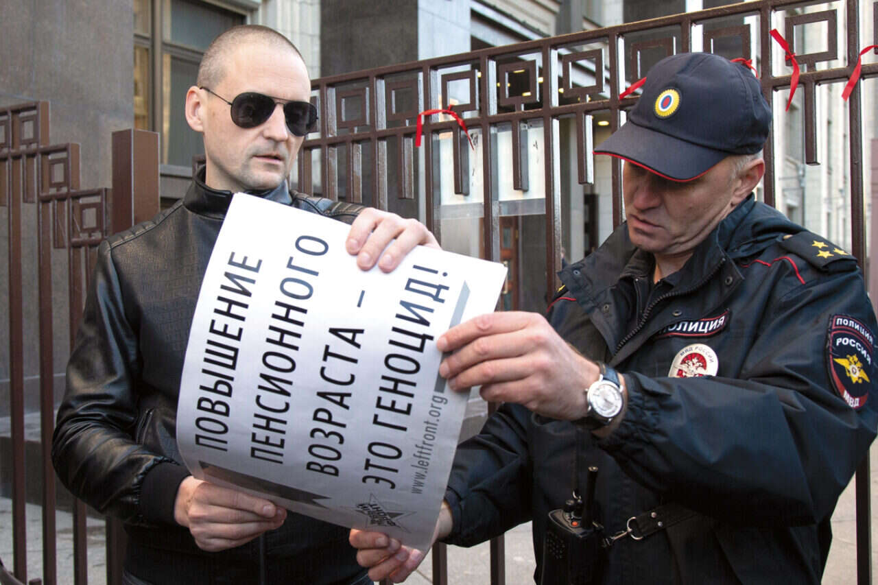 חופש הביטוי נמצא תחת פיקוח. שוטר מעכב מפגין במוסקבה, שמחה על שינוי גיל הפרישה // צילום: אי.פי // חופש הביטוי נמצא תחת פיקוח. שוטר מעכב מפגין במוסקבה, שמחה על שינוי גיל הפרישה