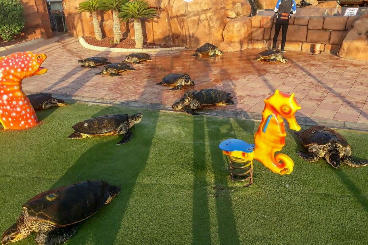 צבי הים הקרניים בפארק המצפה התת ימי באילת, הוצאו מהבריכה לבדיקות מקיפות הנערכות כמה פעמים בשנה, כחלק מהטיפול השוטף. להפתעת צוות הצוללים, הצבים קיימו מירוץ אשר במהלכו הם התרוצצו באתר, הצבה שירי זכתה במירוץ.