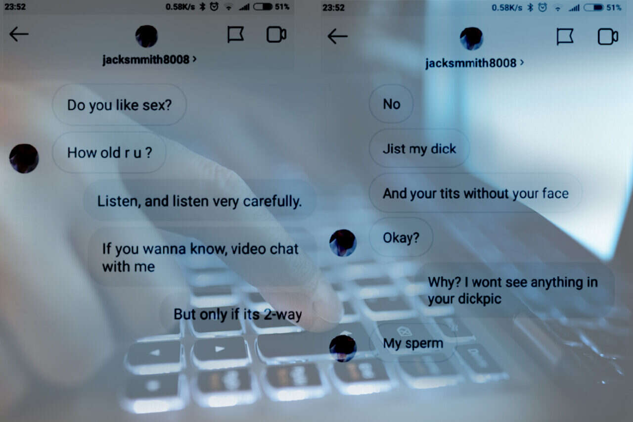 בהתכתבות החמורה שהגיעה לידי "ישראל היום", שואל האיש שמכנה את עצמו Jacksmmith8008 את הילדה - "האם את אוהבת סקס?". בתשובה מבהירה לו הילדה שהיא רק בת 14, אך זה לא מפריע לו להמשיך - "תראי לי את הציצים שלך, אני אחשוף את איבר המין שלי בפנייך".