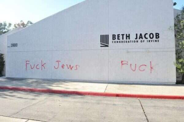 "אני מצטער מאוד לדווח שאמש 'בית יעקב' היווה מטרה למעשה פחדני ואנטישמי בקיר הקדמי של בית הכנסת", נרשם בהודעה. על פי ראשי הקהילה, משטרת אירווין חוקרת את המקרה. על פי צילומי האבטחה אותו אדם שריסס את הכתובות לבש "קפוצ'ון, משקפי שמש ומסיכת חדר ניתוח", קפץ מעל הגדר ונכנס לחצר.