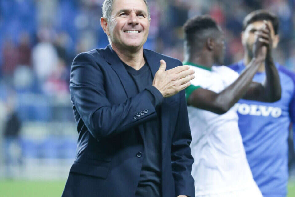אלי גוטמן מודה לקהל הירוק של מכבי חיפה, אתמול בנתניה // צילום: עודד קרני