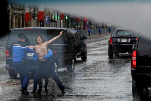 מפגינה פמיניסטית חשופת חזה התפרצה לשיירתו של נשיא ארצות הברית דונלד טראמפ, שהייתה בדרכה לטקס הזיכרון לציון מאה שנים למלחמת העולם הראשונה בפריז.