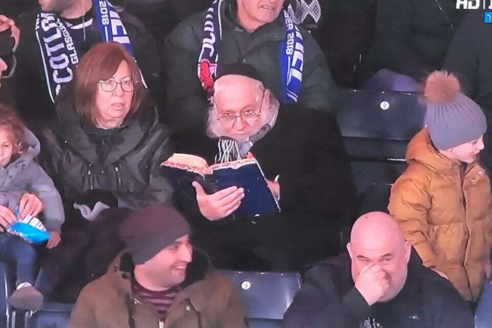במהלך שידור המשחק, עברה לפתע המצלמה לאדם בעל חזות חרדית, שישב בקהל, והיה מרותק לספר שהחזיק בידו. לצדו ישבה אישה חרדית וכן ילד קטן, שצפו במשחק בזמן שהוא לא הרים את מבטו לרגע. "אני חושב שהוא פספסאת הגול", אמר הקריין. "זה בטח ספר טוב".