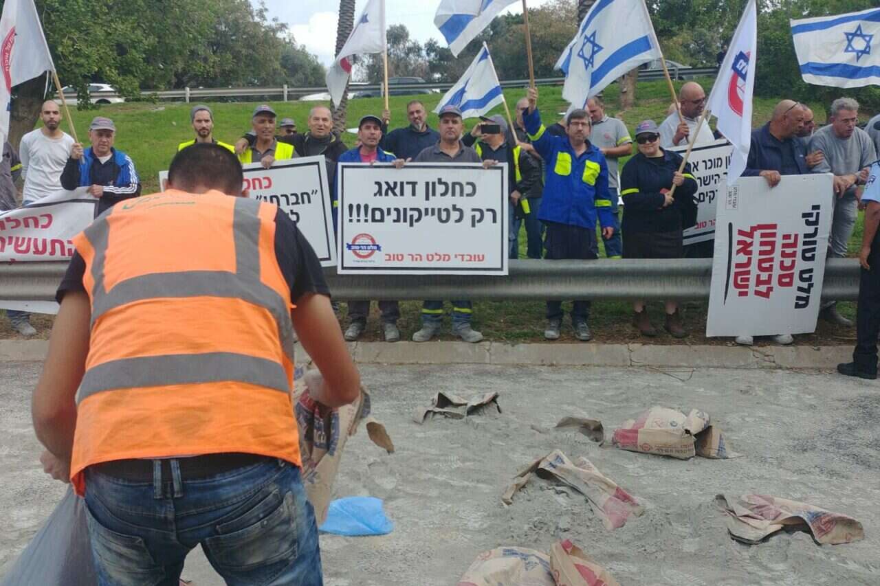 כמה עשרות עובדי חברת "מלט הר טוב" חוסמים את מחלף קיבוץ גלויות, במחאה על יבוא של מלט במחירי היצף מיוון ומטורקיה