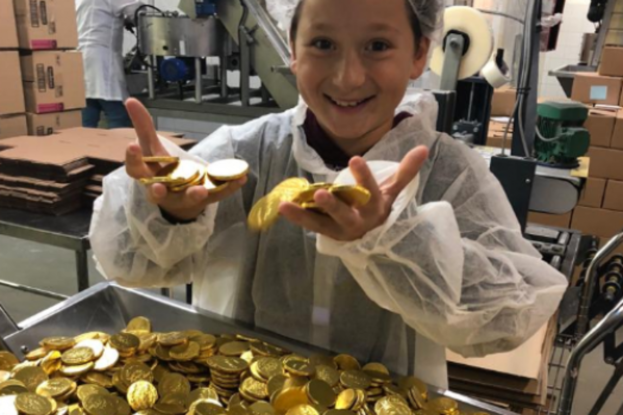 לאחר שצפינו גם במכונה האורזת מטבע מטבע באריזה מטאלית מבריקה וזהובה, ששנו אלי המטמון. חדר שלם מוקדש במפעל לערימות של מטבעות השוקולד המנצנצות באור הניאון כמו אוצר פיראטים מפתה. מכאן הן עוברות אל מסוע האריזה ונארזות לשקיקי רשת המוכרים כדמי חנוכה.