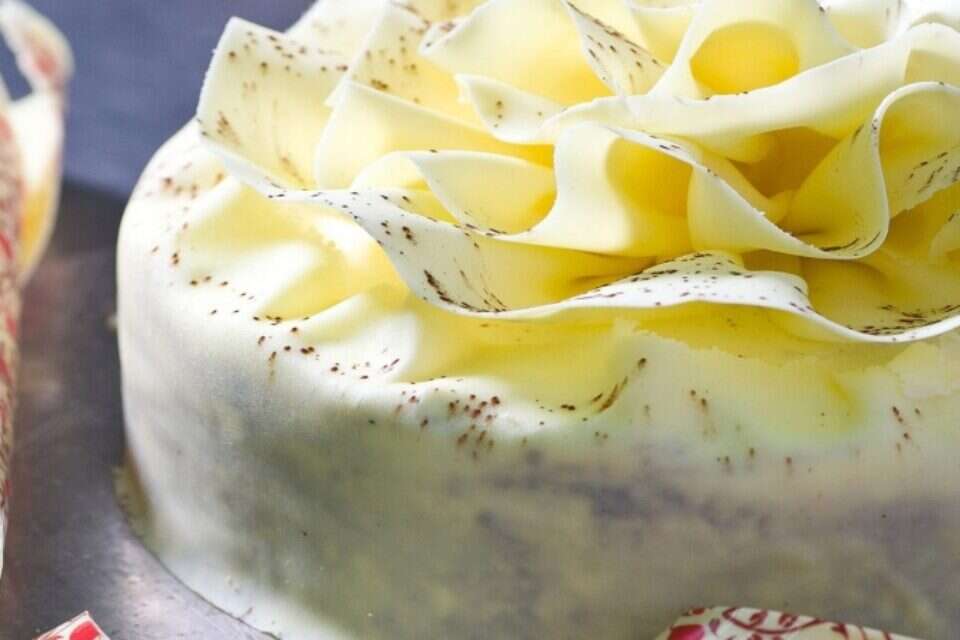 מכינים את הקישוט: ממיסים את השוקולד הלבן לחום "שפתיים", מוציאים את משטח השיש מהמקפיא ועובדים במהירות. יוצקים מעט מתערובת השוקולד המומסת, ומייד, בעזרת סכין חלקה וגדולה, משטחים לשכבה דקה. מחלצים בזריזות את דף השוקולד (מכניסים את הסכין מתחת לשכבת השוקולד ו"מקפלים" את השוקולד מהשיש), מחזיקים את השוקולד בשתי הידיים ומניחים במהירות מסביב לעוגה. כך חוזרים על הפעולה עוד פעמיים-שלוש עם יתרת השוקולד ועוטפים את העוגה.