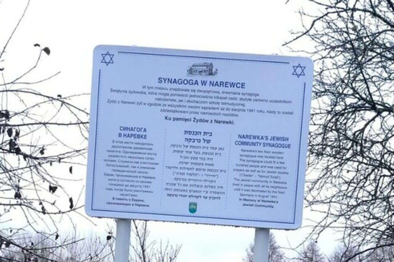 שלט בארבע שפות - עברית, אנגלית, רוסית ופולנית - הוצב השבוע בעיירה הפולנית נרבקה, לזכר בית הכנסת שנשרף על ידי יהודים במקום בתקופת השואה.