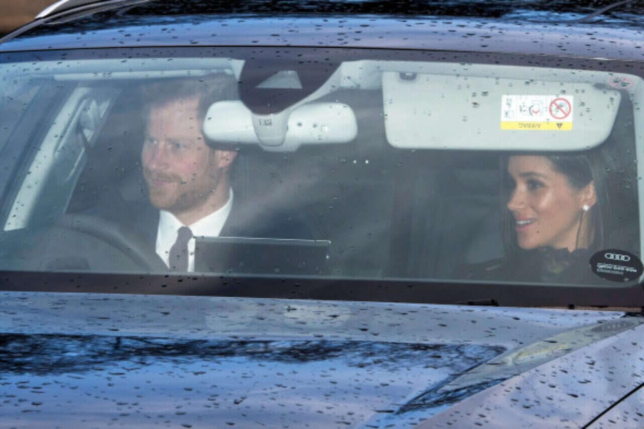 התגברו על המבוכה? הארי ומרקל בדרך לסעודה אצל המלכה אליזבת // מייגן והארי בדרכם לארמון // צילום: אי.פי. איי.