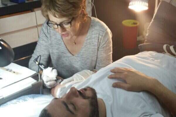 "זו עוד יציאה של החתן שלי. למרות כל ההתנגדויות שלי, הוא הצליח לשכנע אותי שיש אנשים שעושים קעקועים אמנותיים, קטנים וגדולים, והראה לי דוגמאות מהאינטרנט. גם בעלי שיחק פה תפקיד ראשי. לא האמנתי בחיים שהוא יתעניין בתחום כזה".