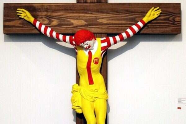 המיצגים מעוררי הסערה קשורים ליצירה "מק ישו" של האמן יאני לינונן, שבו מוצג צלב שעליו תלויה דמותו של רונלד מקדונלד – הליצן של רשת ההמבורגרים הבינלאומית מקדונלד'ס – בתנוחה של ישו הצלוב.