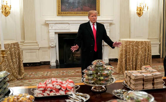 הנשיא אירח בבית הלבן את אלופת ליגת הקולג'ים בפוטבול, אוניברסיטת קלמסון, לחגיגה מסורתית. אלא שבגלל השביתה הנמשכת בממשל, רבים מאנשי הצוות בבית הלבן, בכלל זה השפים, אינם עובדים. על כן, הנשיא החליט להזמין, על חשבונו, שלל מנות ממסעדות הפאסט פוד האמריקניות הפופולריות.