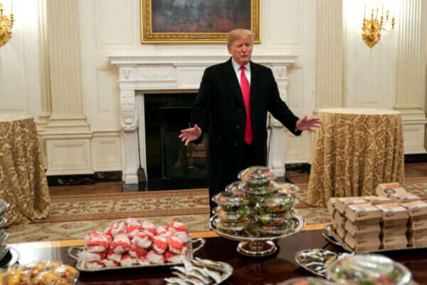הנשיא אירח בבית הלבן את אלופת ליגת הקולג'ים בפוטבול, אוניברסיטת קלמסון, לחגיגה מסורתית. אלא שבגלל השביתה הנמשכת בממשל, רבים מאנשי הצוות בבית הלבן, בכלל זה השפים, אינם עובדים. על כן, הנשיא החליט להזמין, על חשבונו, שלל מנות ממסעדות הפאסט פוד האמריקניות הפופולריות.