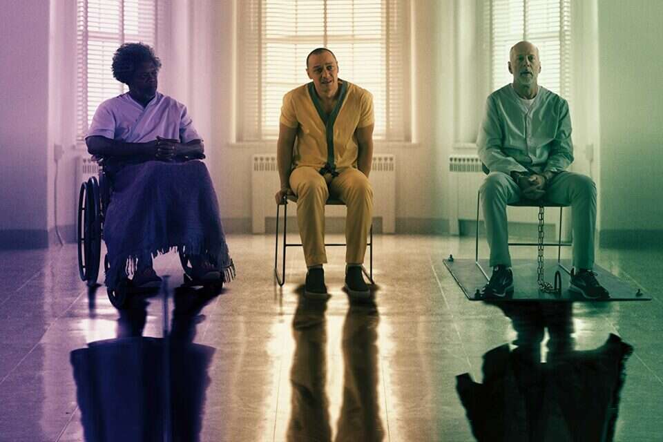 גם מבחינה עלילתית "מיסטר גלאס" הוא טוטאל לוס. כמו שהובטח לנו בסופו של "ספליט", נקודת הפתיחה של הסיפור שולחת את גיבור העל הישנוני שמגולם בידי וויליס בעקבותיו של מקאבוי (שממשיך לרצוח נערות תמימות באין מפריע). אך כעבור כעשר דקות לא רעות (הכל יחסי), החגיגה נגמרת. השניים נלכדים ומושלכים למאסר בבית חולים פסיכיאטרי, ושם הם פוגשים את דמותו השטנית והשברירית של ג'קסון, שכלוא במקום כבר 19 שנה, ואת ד"ר סטייפל (שרה פולסון) – פסיכיאטרית שנחושה מאוד לשכנע את שלושתם שהם סתם אנשים רגילים וחסרי כוחות על.