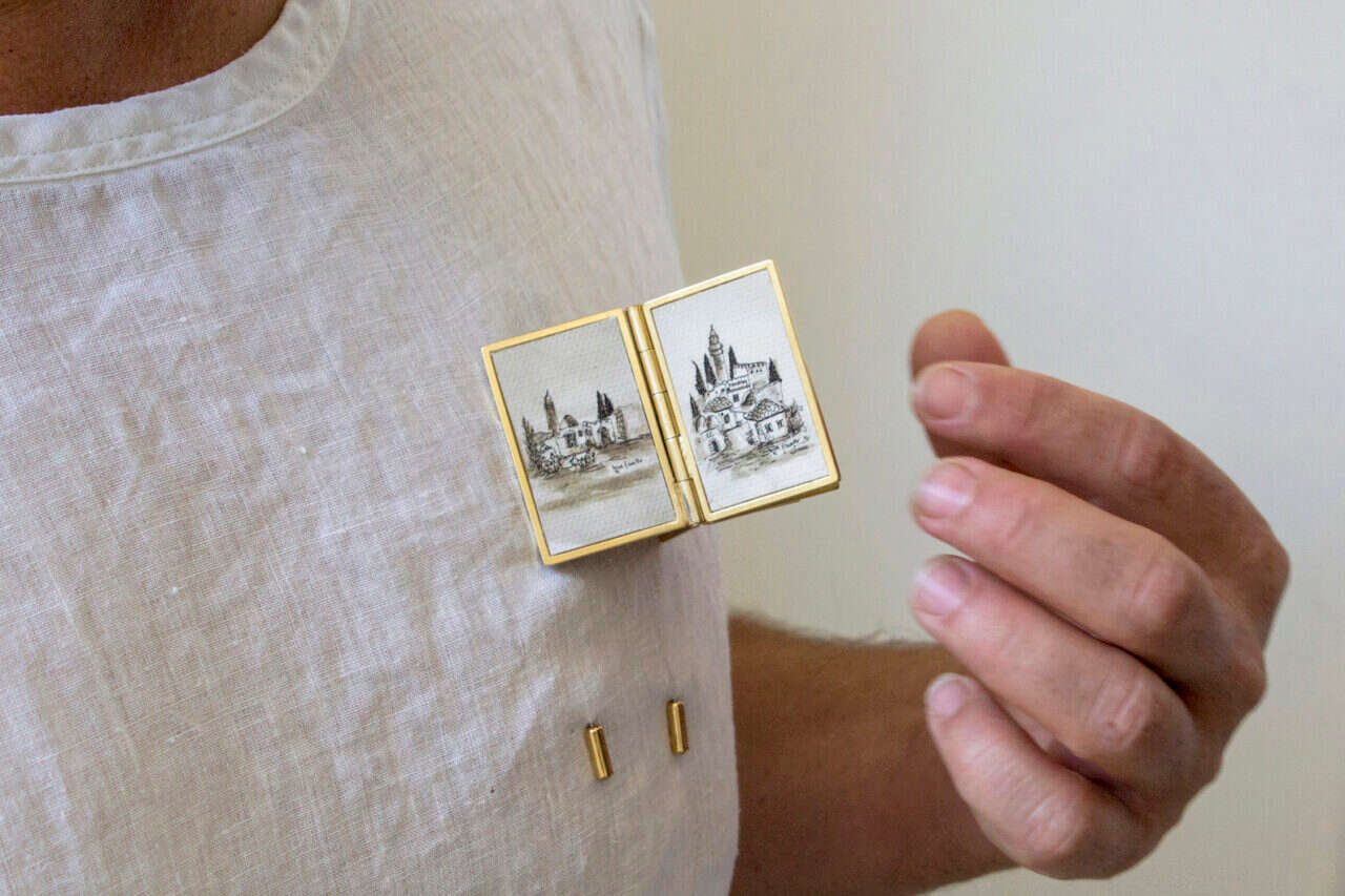 עומרי גורן, סיכת רישומי נוף ישראלי. הדפס שחור ופליז מצופה זהב, 2018 // צילום: מתן קזרוב