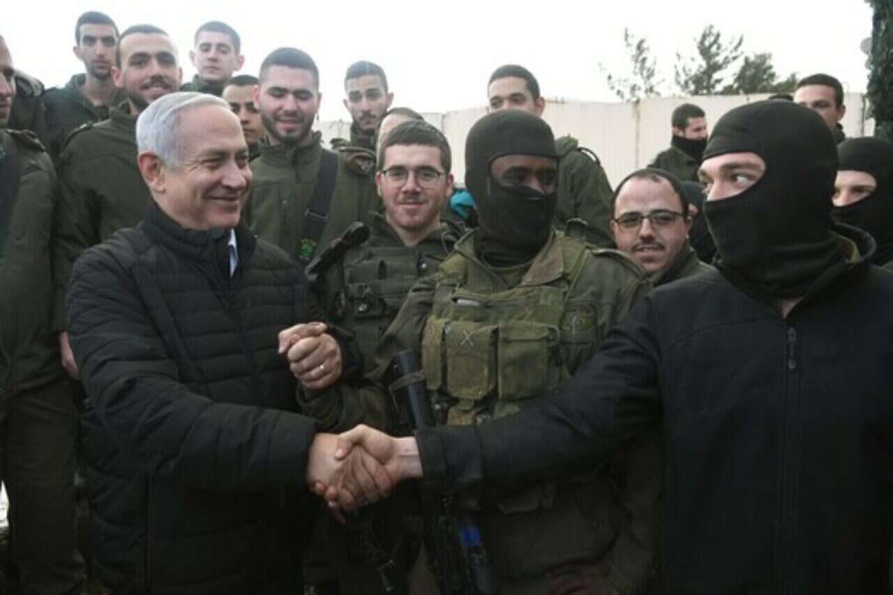 "הייתי רוצה מאוד לקחת אתכם פנימה איתי לתוך הבסיס, אבל יש להם איזו הנחיה מוזרה - אי אפשר להצטלם עם חיילים", אומר נתניהו בסרטון, ומוסיף: "בעצם, גם אני הייתי חייל ומפקד בסיירת מטכ"ל, אז אולי אסור לצלם גם אותי... לא יודע, יש להם כל מיני דברים מוזרים".