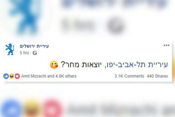 "עיריית תל אביב-יפו, יוצאות מחר?":עיריית ירושלים פרסמה היום (רביעי) בפייסבוק פוסט שבו תייגה את מקבילתה מהמרכז לקראת הוולטיינס שיצוין מחר בערב, והתגובות ברחבי הרשת לא איחרו להגיע.