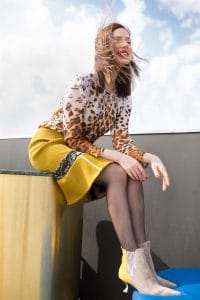 למטה מימין, חולצת משי בהדפס מנומר של המעצבת אליאן סטולרו, שהשכילה להכניס הד עם פס מנומר גם בחצאית ולא להעמיס יתר על המידה. משמאל שמלת מעיל של מאיה נגרי מויניל (2,190 ש"ח) הנלבשת מעל מכנסי ג'ינס וחולצת גולף בצבע חלק ורגוע.