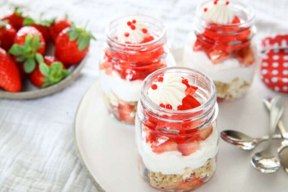 מקציפים שמנת מתוקה וסוכר לקצפת יציבה. בכלי הגשה שקופים מסדרים שכבות של תותים, מרנג, קרמבל וקצפת. מקשטים בקוביות ג'לי ומגישים.