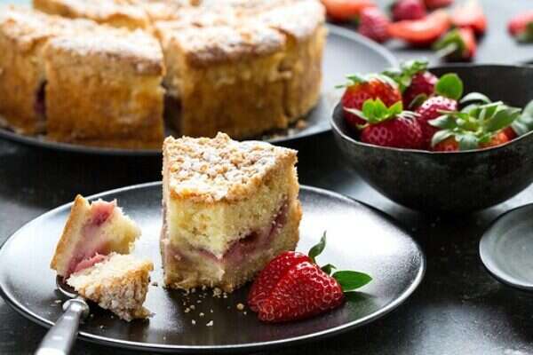 עוגה בחושה מושלמת לצד הקפה. זוהי לא עוגה בחושה רגילה, כי היא מחביאה בתוכה שלושה מרקמים שונים וטעמים יוצאי דופן. תערובת העוגה מכילה גבינה, מה שהופך אותה לעסיסית ולנימוחה יותר והיא מכילה תותים טריים - שאפשר להחליף בכל פרי אחר או אפילו בתותים קפואים - וקראמבלס שקדים עם פניני סוכר. המתכון מתאים לתבנית בקוטר 24 ס"מ. דרגת קושי: בינונית.