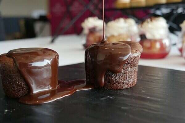 לאחר מכן שופכים את השוקולד המומס לביצים לאט לאט (על מנת שהביצים לא יתבשלו) ומערבבים עד שהכול מתאחד. מזלפים לתנור ואופים כ-13 דקות בתנור שחומם מראש ל-170 מעלות