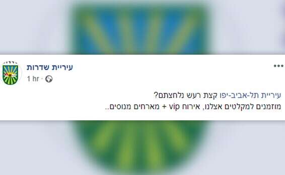 פוסט בפייסבוק של העיר מוכת הטילים עקץ את תושבי תל אביב בצורה משעשעת וצינית במיוחד. בתגובה לירי הטילים לעבר תושבי גוש דן, העירייה מציעה לתל אביבים אירוח VIP עם המון ניסיון במצבים מהסוג הזה. הפוסט זכה למאות תגובות ושיתופים.