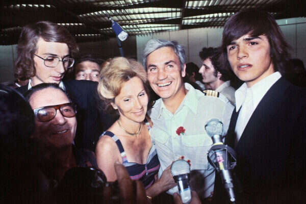 שר החוץ דאז יגאל אלון (עם גבו) ומישל בקוס (משמאל) בקבלת הפנים בנמה"ת בן גוריון, 1976 // צילום: אי.פי