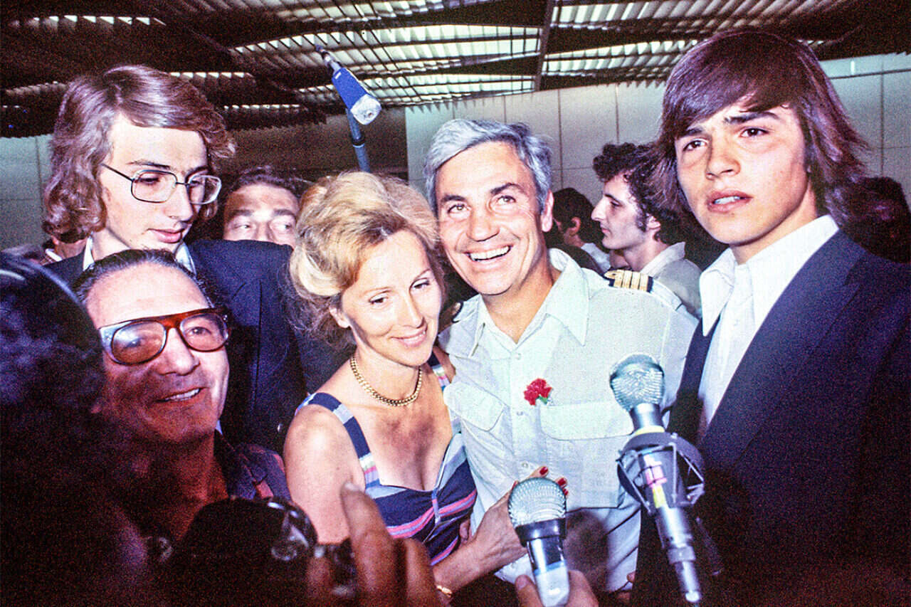 קפטן מישל בקוס (במרכז) לאחר החילוץ מאנטבה // צילום: איי. אף. פי