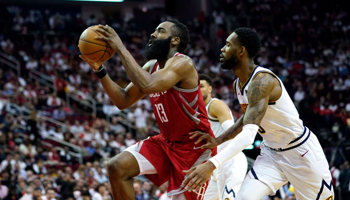 הארדן בדרך לסל של דנבר. הצהרת כוונות של יוסטון // צילום: אי.פי // הארדן בדרך לסל של דנבר. הצהרת כוונות של יוסטון