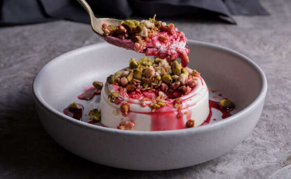 מסעדת TYO מציעה מלבי אקספרס - קולי פטל, קרם  מלבי שערות קדאיף ואגוזים מסוכרים. המנה מוצעת במשלוח בלבד.